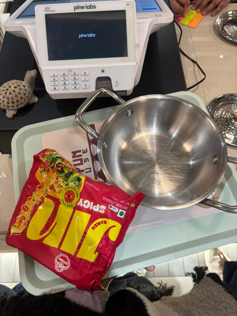Once your toppings are chosen, the team takes your custom bowl to the kitchen. It’s cooked with care and served steaming hot in a deep bowl almost like a small kadai designed to hold plenty of broth, noodles, and toppings without spilling. This presentation mirrors traditional ramen serving styles but with an Indian café twist that makes it feel hearty and homey.